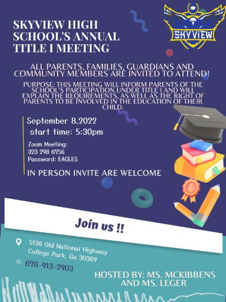 To all parents, families, guardians, and community members... it's that time of the year again!! Skyview High School will be hosting our annual Title I meeting. The purpose of this meeting is to inform parents of the school’s participation under Title I and will explain the requirements, as well as the rights of parents to be involved in the education of their child. We look forward to seeing you at the school on September 8,2022 at 5:30pm or via ZOOM: