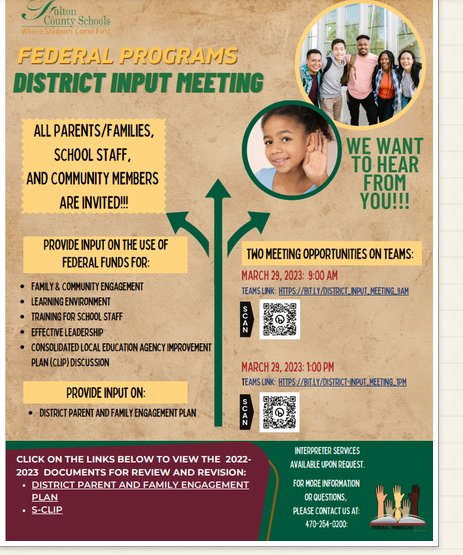 We are inviting you to share your feedback with developing and revising our school-family compact and school parent and family engagement plan for the 2023-2024 school year on March 29,2023. This includes input on the 1% family engagement budget and staff training in family engagement. These documents outline how our school will partner with parents and families to support student success and describe how we will provide opportunities to improve family engagement.