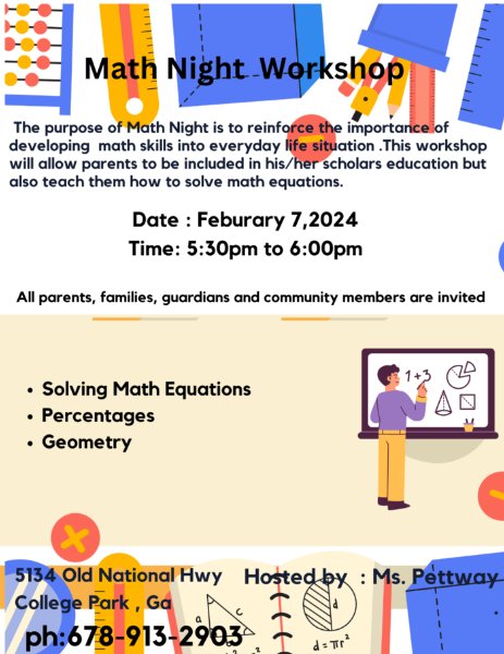 Math Night will be an in-person workshop which will require hands on cooperation. The purpose of math Nnght is to reinforce the importance of developing our math skills into everyday situations. This workshop will also provide parents with a chance to be included in his/her scholars' education but also teach them how to solve math equations using basic math skills.