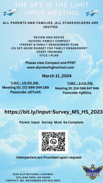 Parents, Guardians and stakeholders I would like to invite you to come out to attend Skyview's Input Meeting on March 11,2024 we will have two times you can attend 10:00am and 3:00 pm. The input meeting will allow you to give your feedback on the Following Topics: