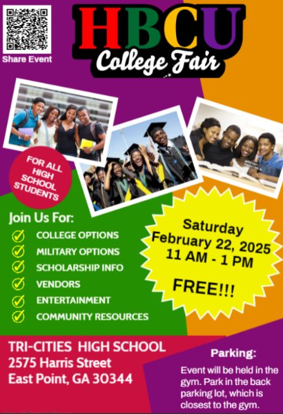 Your students are invited to attend the HBCU College Fair that will be held at Tri-Cities High School on February 22, 2025 at 11:00 AM. This event is free, and it is open to all high school students and families. A
